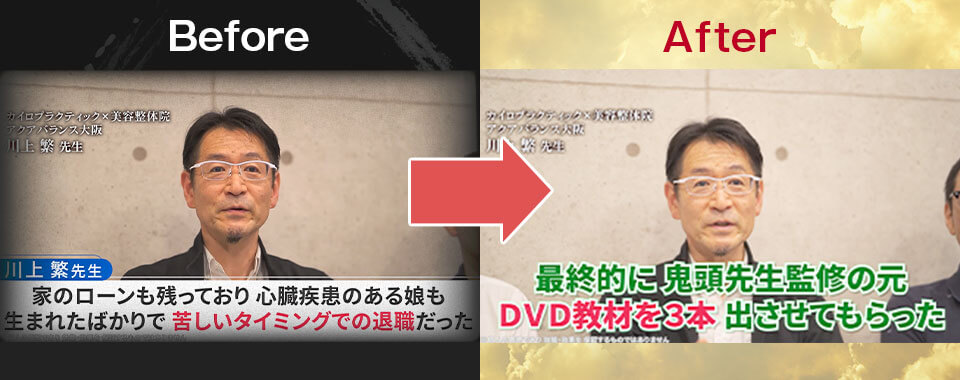 川上繁先生は一流企業の管理職クラスまで昇りつめ、憧れのマイホーム、念願の愛娘を授かるなど…まさに順風満帆な暮らしを送っていました。しかし、ある時突然会社を半ば強制的に退職させられることに。そんな中、開発者の技術を学び、今では月商200万円を達成。さらに手技DVDを3枚出版に加え、自身で整体スクールも開校、今度はその生徒がわずか半年で年商1,000万円を達成するほどの一流治療家に成功するなど、どん底から超一流指導者にまで成り上がりました。